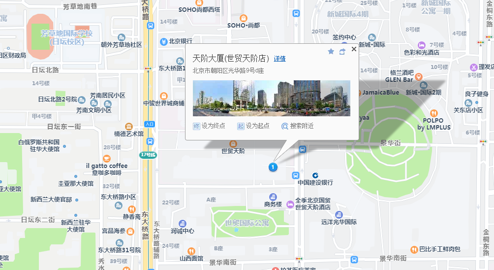 酒店:北京辉盛阁国际公寓、北京东方宫霄酒店、世界城、北京千禧大酒店、北京制药厂宿舍楼、北京香格里拉嘉里中心大酒店、羲和旅行社有限责任公司、荣宝宾馆、北京中国太和国旅、国安宾馆